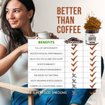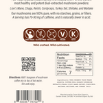 Ingredientes: Café Arábica orgánico de comercio justo del USDA, extractos de hongos orgánicos del USDA (melena de león, chaga, reishi, cordyceps, maitake, shiitake y cola de pavo).