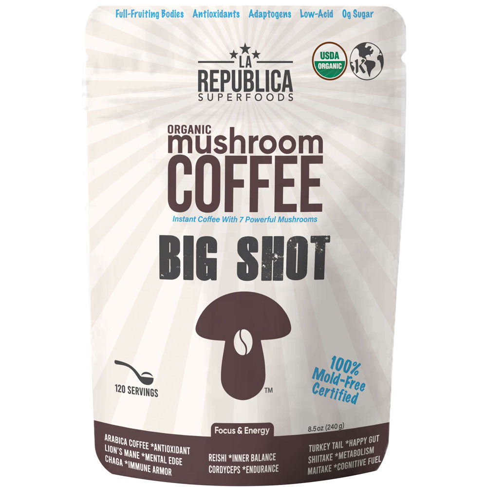 Experimente el espectro completo de los beneficios de la naturaleza en cada taza. El café orgánico con champiñones Big Shot del USDA de La República es su pasaporte hacia una vida más equilibrada y vibrante, un sorbo a la vez. Abrace el poder de estos extraordinarios hongos y libere el potencial de bienestar y longevidad de su cuerpo.