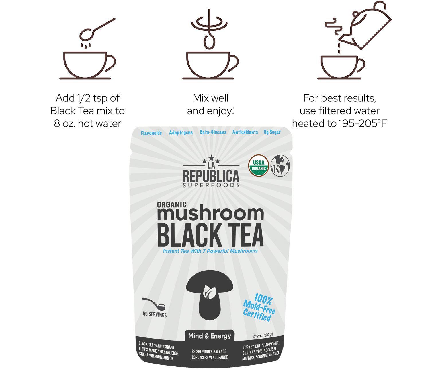 A sophisticated fusion of bold organic black tea and seven time-honored functional mushrooms. Crafted for those who value both taste and purpose, this adaptogenic blend delivers a rich, full-bodied experience that fuels clarity, balance, and daily resilience.