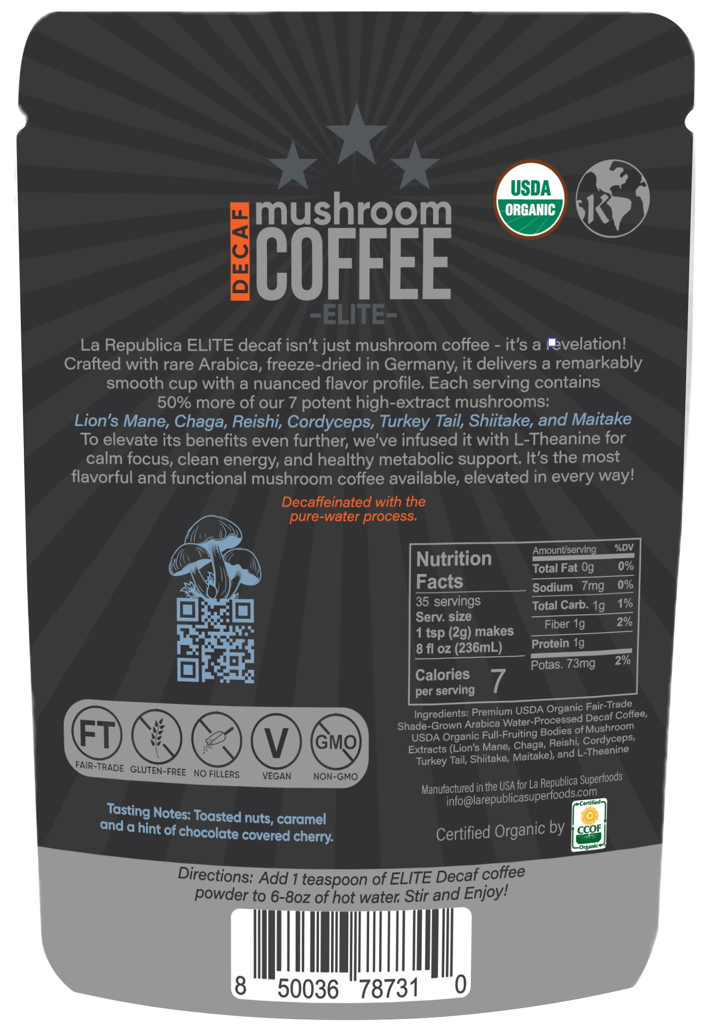 La Republica Elite™ Decaf is designed for those who love the ritual and richness of coffee, but prefer a more grounded, caffeine-free experience. We begin with organic, fair-trade, shade-grown Arabica coffee, carefully water-processed to remove caffeine naturally—never using chemicals—so the bean’s smooth character and integrity remain fully intact.