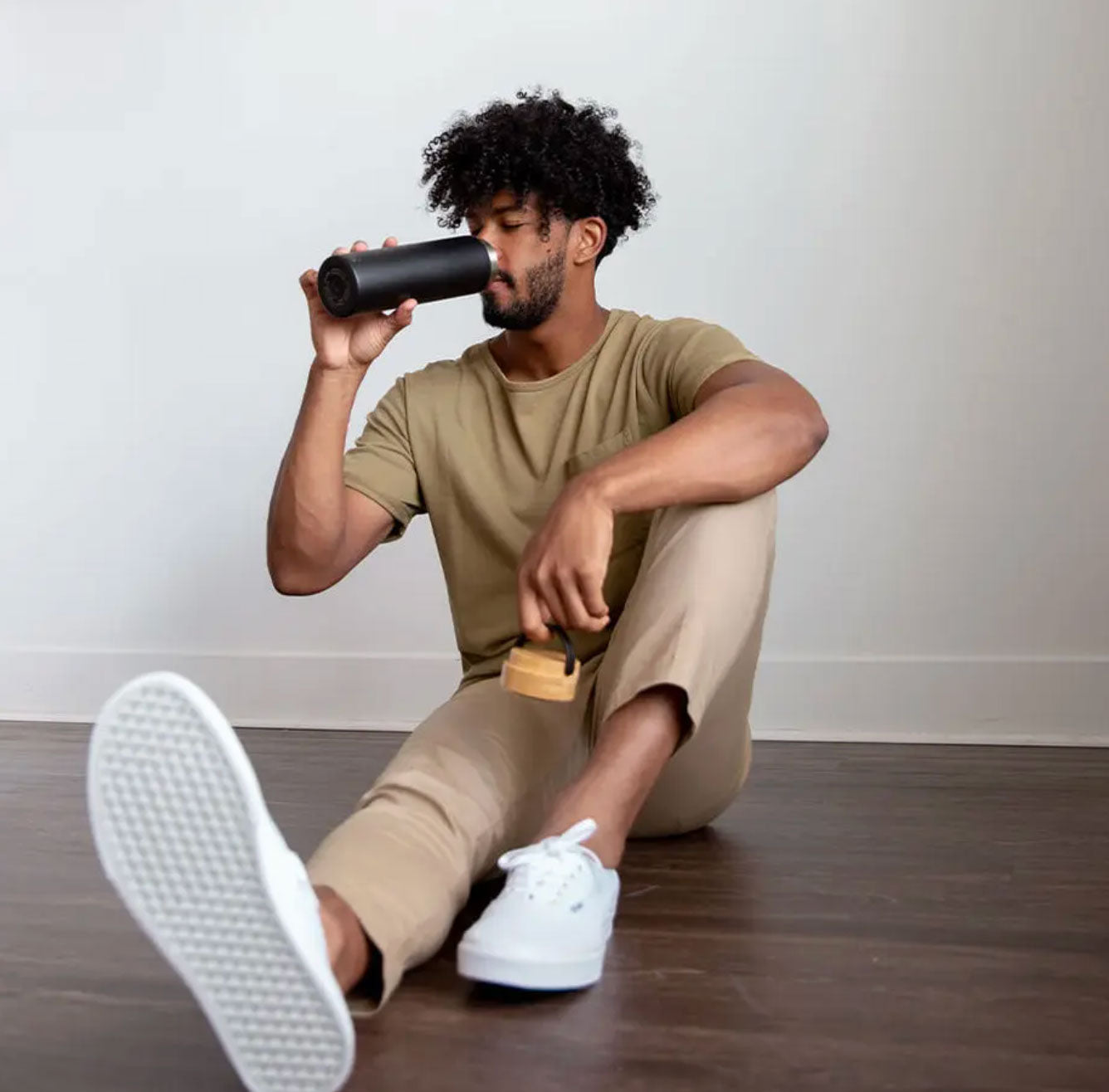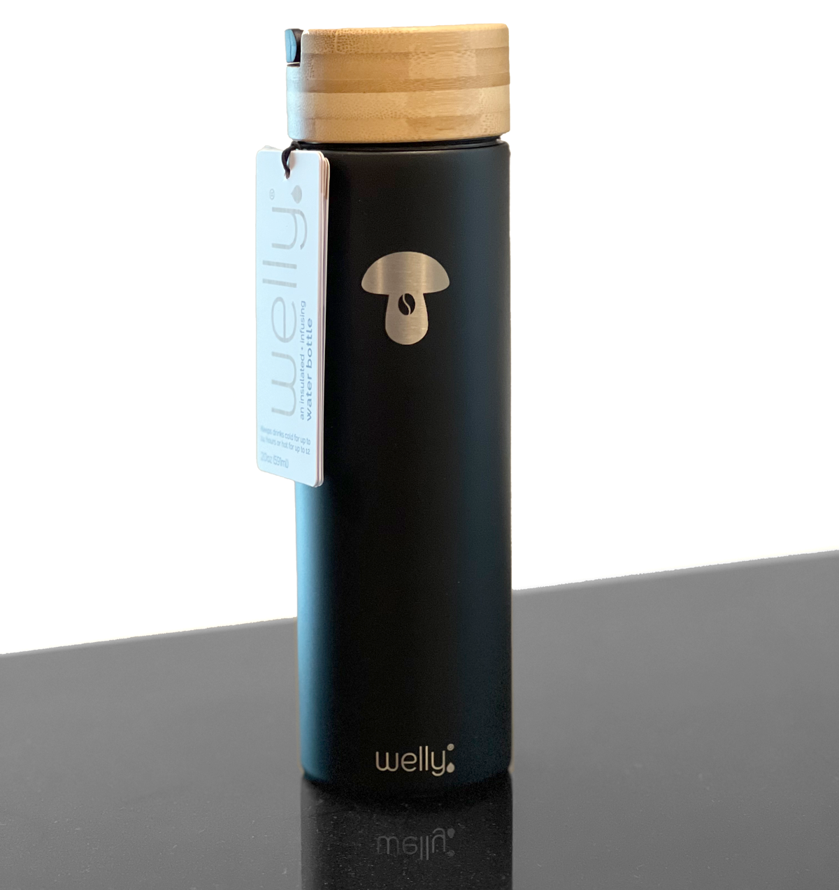 Beautifully designed, easy-clean, triple-walled copper vacuum-insulated bottle in matte black. Comes with a convenient bamboo loop cap to easy-carry while you are on the go. Keeps your mushroom coffee hot or your iced mushroom coffee cold for hours! This also has a removable infuser to brew tea or flavor water with fruit:)