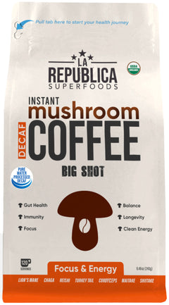 Experience the perfect harmony of flavor and function with La Republica’s water-processed DECAFFEINATED Organic Mushroom Coffee — a masterful fusion of premium Arabica coffee and nature’s most potent superfoods. Crafted for mindful mornings, this luxurious blend delivers clean, calm energy without the caffeine crash.