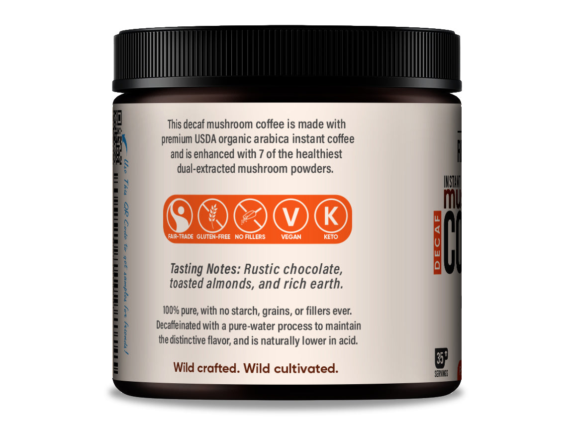 Ingredients: USDA Organic Fair-Trade Pure-Water Decaffeinated Arabica Coffee, USDA Organic Mushroom Extracts (Lion's Mane, Chaga, Reishi, Cordyceps, Maitake, Shiitake, and Turkey Tail).
