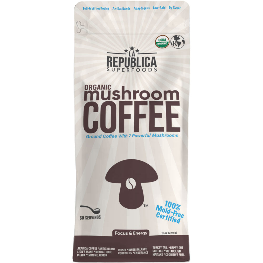 Seven Superfood Mushrooms: La Republica Super 7 Mushroom Ground Coffee combines the rich, robust flavor of premium coffee beans with the goodness of seven superfood mushrooms: Reishi, Chaga, Lion's Mane, Turkey Tail, Shiitake, Cordyceps, and Maitake. Each mushroom brings its unique health benefits to your cup.